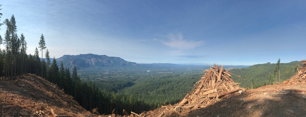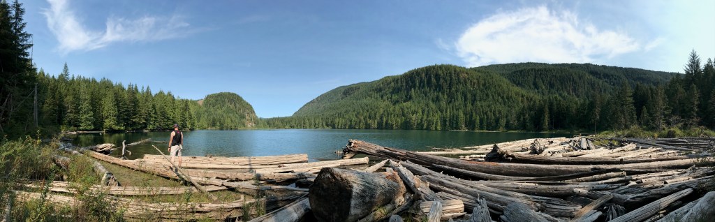 The top gravel trail was definitely not as exciting as the steep dirt trails, so we took this time to chat and fuel up on Clif bars and more beef jerky. However, there was one sweet lookout spot on the way to the lake with a bunch of cut down lumber from a local company we stopped by.